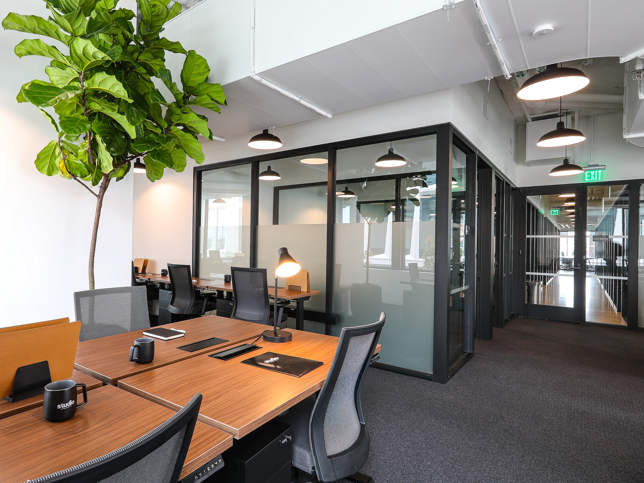 The space itself is distributed across multiple floors and includes a range of environments: meeting rooms, private offices, open cubicle areas, a lounge, and an event space. Both interior and exterior areas are part of the overall layout, and photographing the project required attention to how these different zones connect and function together.